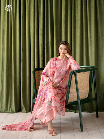 • Duppata: Digital Printed Bamber Chiffon Embroidered Cut-Work