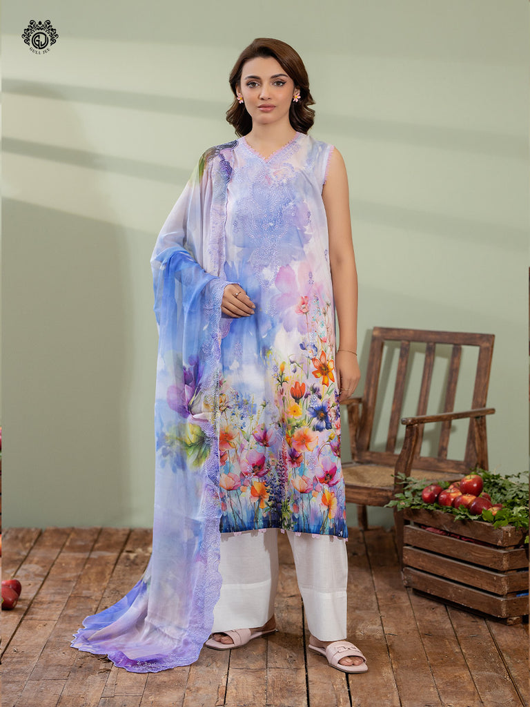 • Duppata: Digital Printed Bamber Chiffon Embroidered Cut-Work