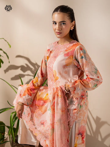 • Duppata: Digital Printed Bamber Chiffon Embroidered Cut-Work
