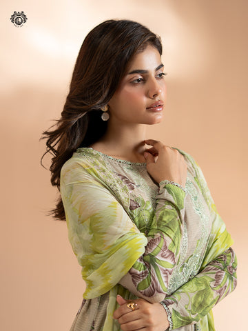 • Duppata: Digital Printed Bamber Chiffon Sequin Embroidered Cut-Work